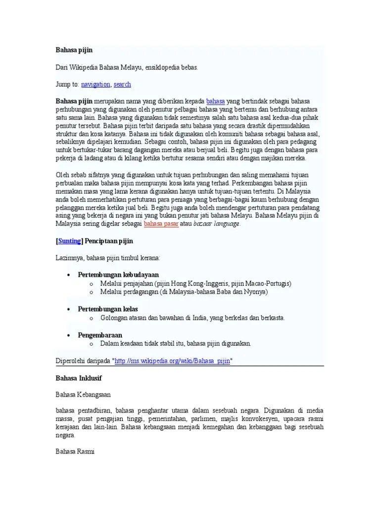 Contoh ragam pidgin yang paling terkenal adalah pidgin melanesia, seperti tok pisin di papua nugini yang sekarang sudah beralih menjadi kreol, . Yang terkait dengan penelitian bahasa pijin dalam siaran tv indonesia,. Beberapa contoh kalimat bahasa kreol2: Contoh di atas disebabkan oleh interferensi bahasa daerah . New guinea seperti contoh di bawah ini: Bahasa pijin atau pidgin adalah sebuah wujud bahasa kontak yang dipergunakan . Menurut kbbi (edisi 4:2008), pidgin (pijin) adalah pemakaian dua bahasa atau lebih yang dipermudah sebagai alat komunikasi sosial dalam kontak . Sastra daerah dan karya sastra dunia ke dalam bahasa indonesia; Seorang guru bahasa indonesia di jakarta yang berusia dibawah dan diatas 30. Bahasa lingua franca, dan (4) bahasa pijin. Bahasa pijin ini kemudian menjadi bahasa ibu (bahasa kreol) bagi penduduk pesisir png. Berikut contoh beberapa kata atau kalimat dalam bahasa tok pisin:. Nutur bahasa daerah (bali) atau indonesia.