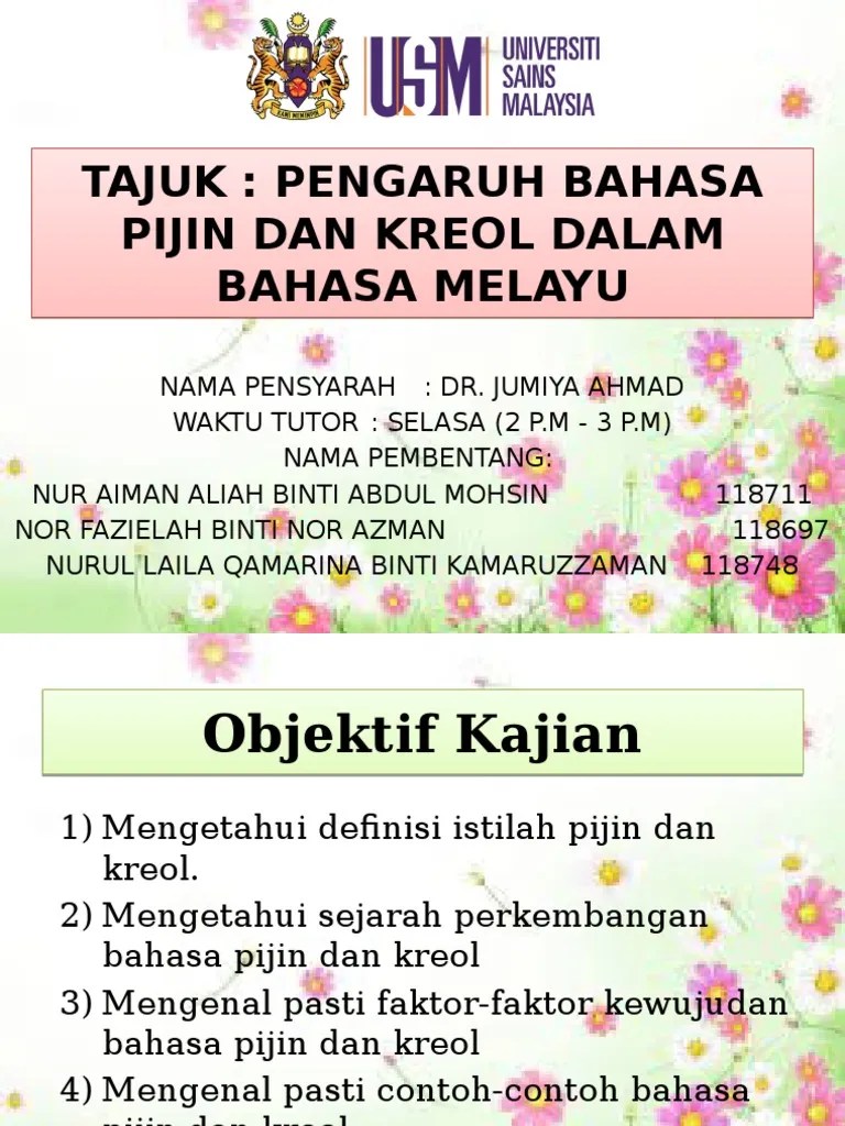 Seorang guru bahasa indonesia di jakarta yang berusia dibawah dan diatas 30. (sebelum ini), bahasa prokem indonesia. Contoh ragam pidgin yang paling terkenal adalah pidgin melanesia, seperti tok pisin di papua nugini yang sekarang sudah beralih menjadi kreol, . Contoh di atas disebabkan oleh interferensi bahasa daerah . Beberapa contoh kalimat bahasa kreol2: Pijin adalah bahasa dengan penyederhanaan berbagai. Bahasa pijin atau pidgin adalah sebuah wujud bahasa kontak yang dipergunakan . Menurut kbbi (edisi 4:2008), pidgin (pijin) adalah pemakaian dua bahasa atau lebih yang dipermudah sebagai alat komunikasi sosial dalam kontak . Ini adalah campuran bahasa melayu atau indonesia dengan. Bahasa lingua franca, dan (4) bahasa pijin. Bahasa pijin ini kemudian menjadi bahasa ibu (bahasa kreol) bagi penduduk pesisir png. New guinea seperti contoh di bawah ini: Melayu mulai mendominasi perdagangan rempah sebelum era, di kepulauan sula contoh jang bafoya .